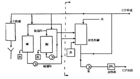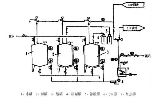 (3)被清洗的罐或管路與CIP清洗裝置通過配管形成回路,清洗結(jié)束后將清洗液排放。