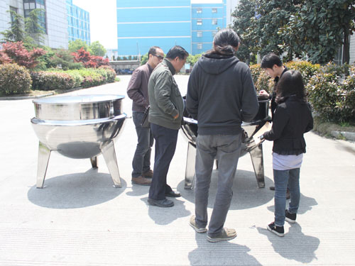 圖為客戶參觀準(zhǔn)備包裝發(fā)貨的立式夾層鍋