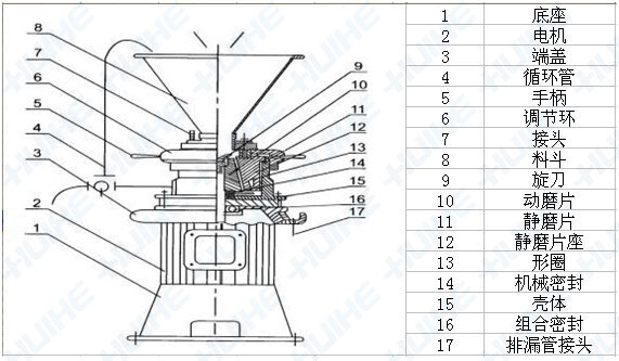 立式膠體磨其主要構(gòu)造由磨頭部件、底座傳動(dòng)部;專用電機(jī)三部分組成。其主機(jī)部份由殼體、定子、轉(zhuǎn)子、調(diào)節(jié)機(jī)構(gòu)、冷卻機(jī)構(gòu)、電機(jī)等組成。具體請(qǐng)看下圖: