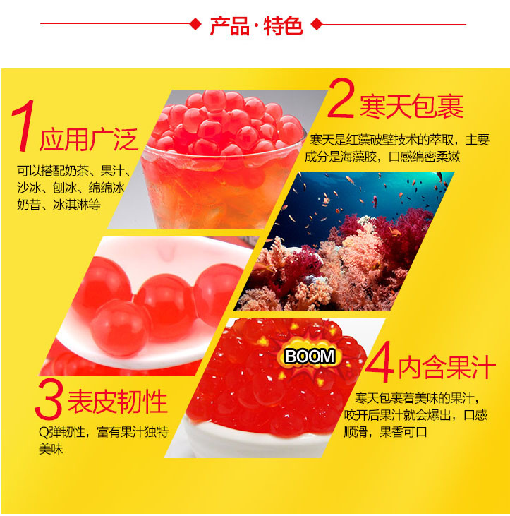魔力豆(爆爆珠): 草莓味爆爆蛋外層為天然海藻膠薄膜。內(nèi)含多變化果汁,經(jīng)低溫殺菌。
